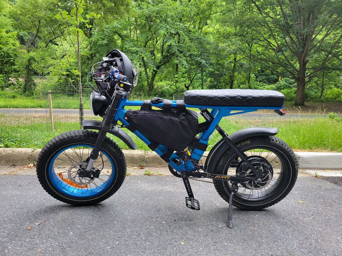 Blueberry started life as a normal e-bike doing normal e-bike things. During the pandemic, we relocated to rural Virginia and I worked around our family’s farm and saved money to buy this bike– the shimmering blue paint and motorcycle styling had me hooked.