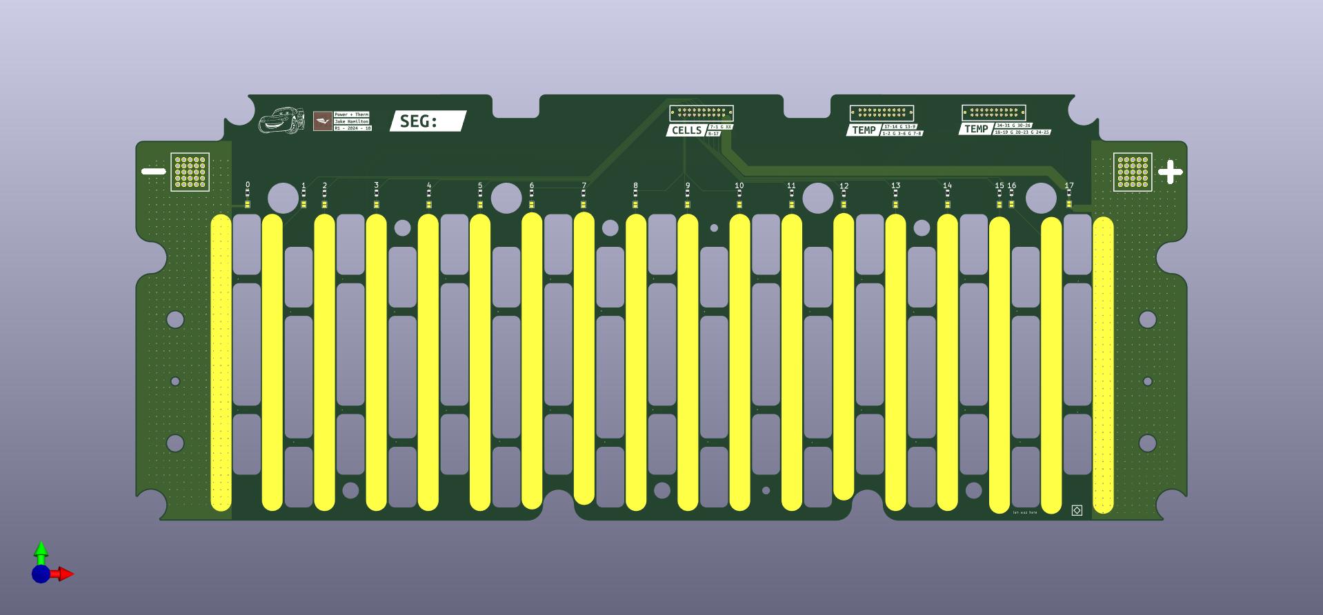 This version fit my first two qualifications of mechanical fit and electrical functionality, but it lacked design quality. The main feedback I received on this design was “more silkscreen!”. Some of my traces were also relatively isolated, which made them prone to EMI—especially worrying since a false temperature spike could shut down our car. In response to the feedback, I consolidated my traces and added informative silkscreen that identified connector numbers, segment numbers, polarity, and parallel cell group numbers.